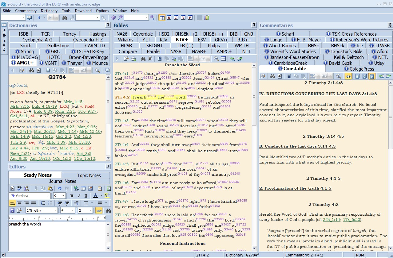 - E-Sword – This package has been available since 2000. It has always been free (which is amazing), although there is a way for you to make a donation to the group that supports the app. It is a very mature app which has a broad range of offerings. The interface is very simple, not fancy but efficient as shown here. All of the various resources are arranged in a group of frames in the main application window, and the resources are all linked to the Bibles you download. So whether you use the NAS, ESV, KJV, when you click on a verse, the app automatically shows a flag on every book that has information related to that verse. In several of the Bible versions (e.g. I use the NAS with Strong’s numbers included) you can click the word’s number and get multiple links in the various dictionaries. This means that you have the capability for unlimited Bible study within one screen on your computer! There is a download tool in the app which makes 100’s of various Bibles, commentaries and dictionaries easily obtainable (many free). And beyond that there is a separate, dedicated site – biblesupport.com – which has thousands of additional works available, many of them major works such as the Expositor’s Bible (also free). The app is clean without trying to be fancy, and it doesn’t break. Here is a view of the main screen with various resource installed and 2 Tim. 4:2 has been clicked on – note all the commentaries on the right which have material on that text , and note on the left the lexicon is showing the Greek information for the word “preach”.