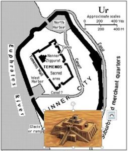 • Ur was near the Euphrates River, existed as far back as 3800BC, and was likely resettled after the flood around 2300BC.  It was a wicked society, obsessed with idolatry, including human sacrifice – they built the “ziggurat” temple, a marvelous tiered pyramid with 75′ high terraces, gardens (inset picture above).  They worshiped the moon god amazingly named “Sin”.  Ur was also a main worship center for the god “sin”.